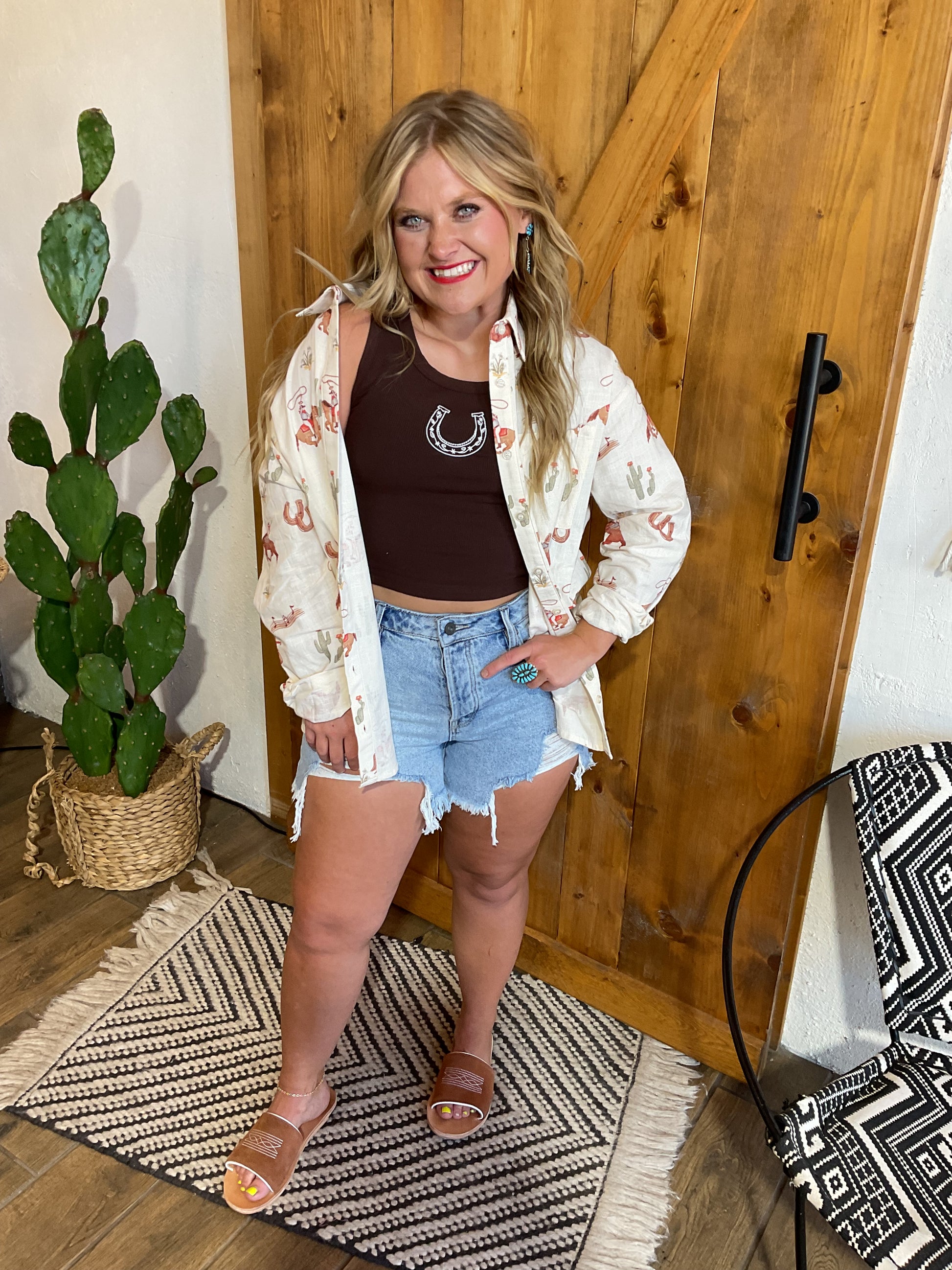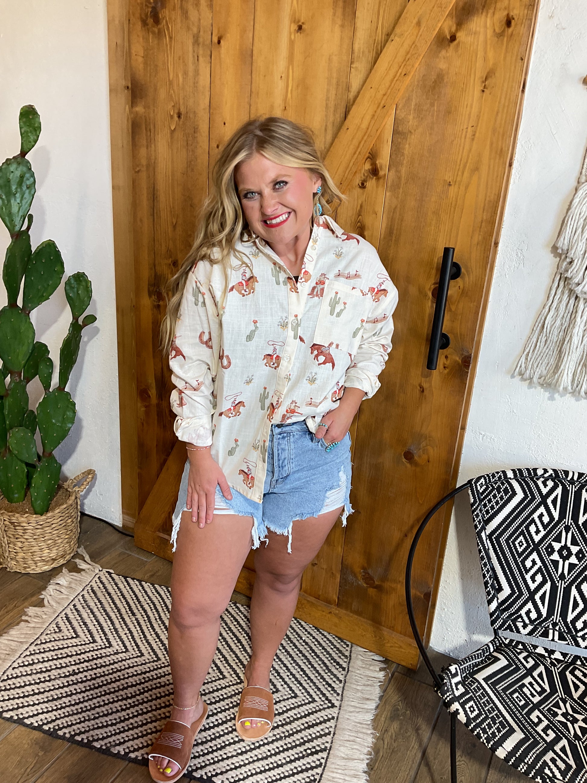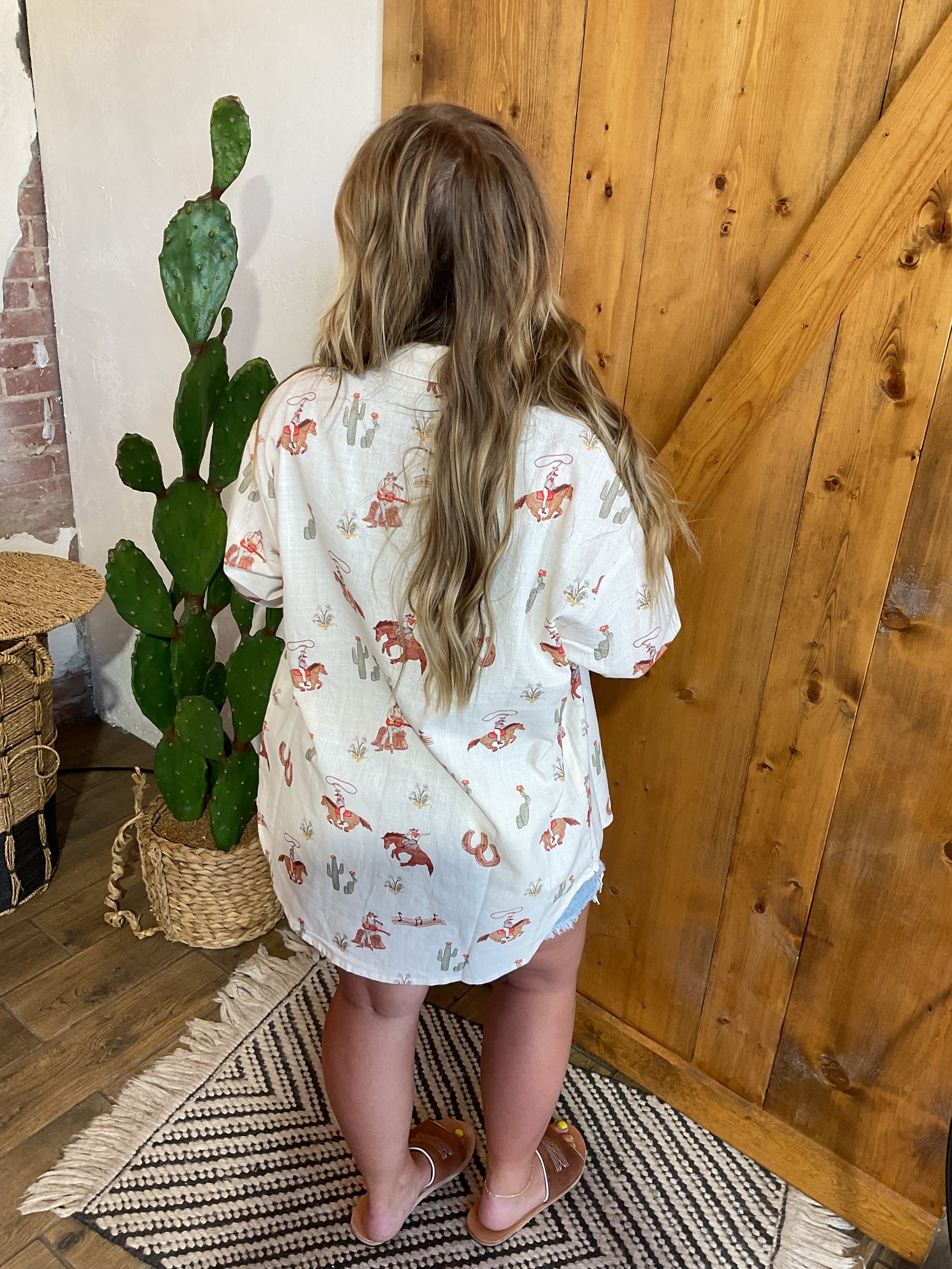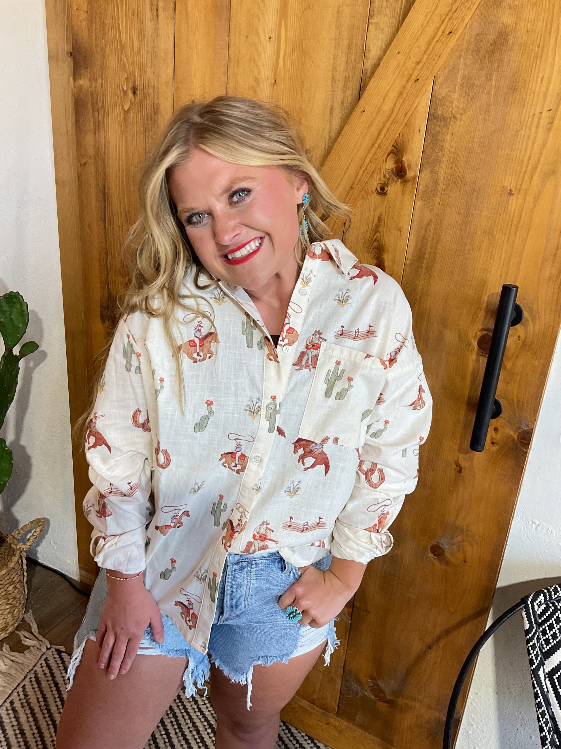 Light weight long sleeve button down with cowboy print
